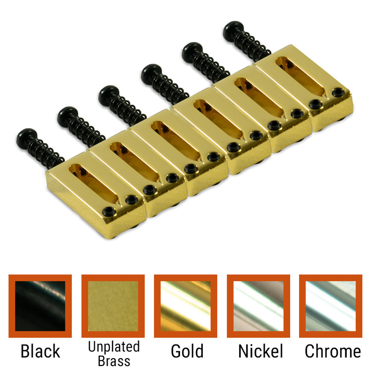 Kluson USA®'s contemporary replacement Brass saddle set is made specifically for the Kluson USA® Contemporary Telecaster® bridge. Available in Chrome, Nickel, Gold and Black plating, or Unplated option with intonation screws and springs.