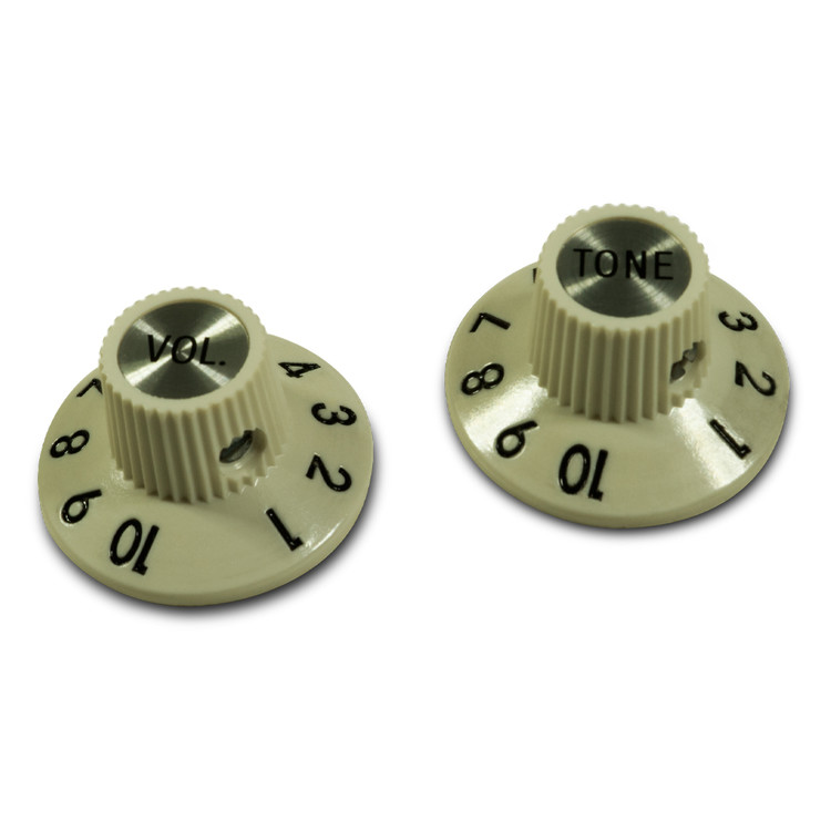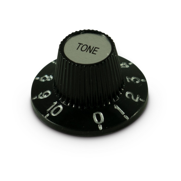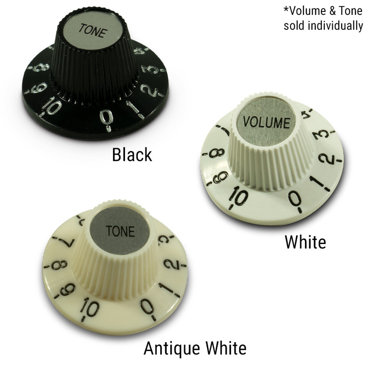 Kluson® recreates the "Witch Hat" knob with Volume or Tone labeled silver cap and I.D. knurled with 18 splines. These are molded black plastic with silver numbers to match the center cap.