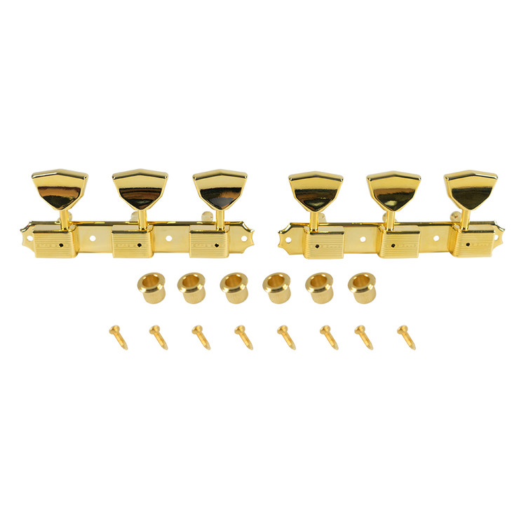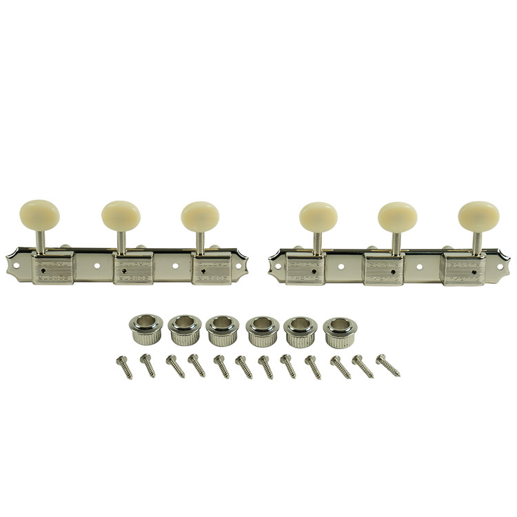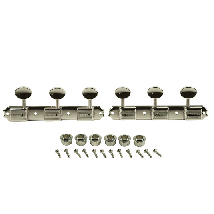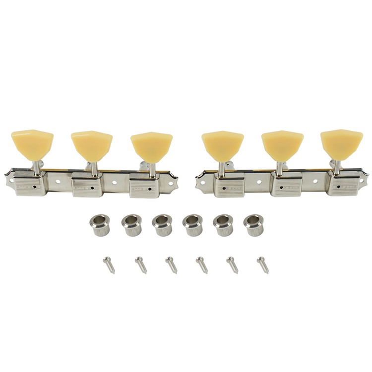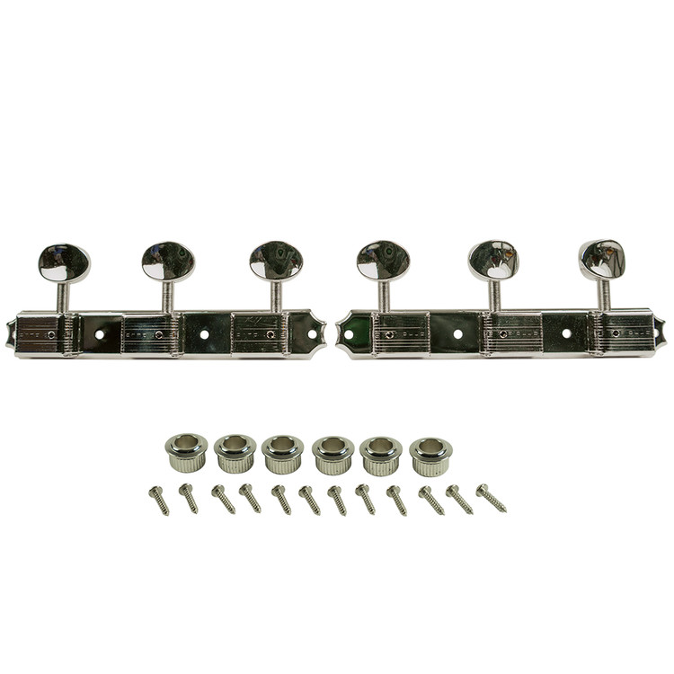 Kluson® plate-mounted 3 per side tuning machine set with improved 15:1 gear ratio for more stable and accurate tuning. The housing and button style are period correct for a variety of production dates. This set comes complete with 2 plates of 3 bass side machines and 3 treble side machines.
