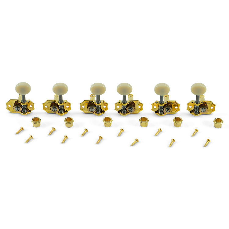These tuning machines are created especially for drop in replacement of old Kluson® tuning machines from the 30’s and 40’s with a 1/4 in. string post diameter. While they look the same, they feature a diecast base, bronze ring gear, stainless worm gear with close tolerance bushings, and 18:1 gear ratio. For solid headstocks with vertical mount.