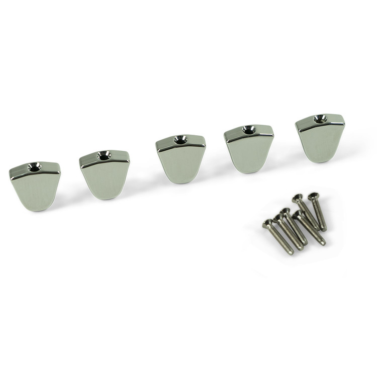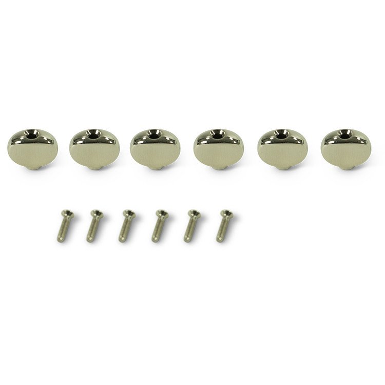 This Kluson® replacement button set for Revloution Series tuning machines is available the popular keystone shape common for 3 per side applications, these keystone buttons can also be used for our 6 in line tuning machines. The small oval button shape for 6 in line tuning machines is availbale as well and will also fit in a 3 per side format. Includes mounting screws and a set of 6 buttons.